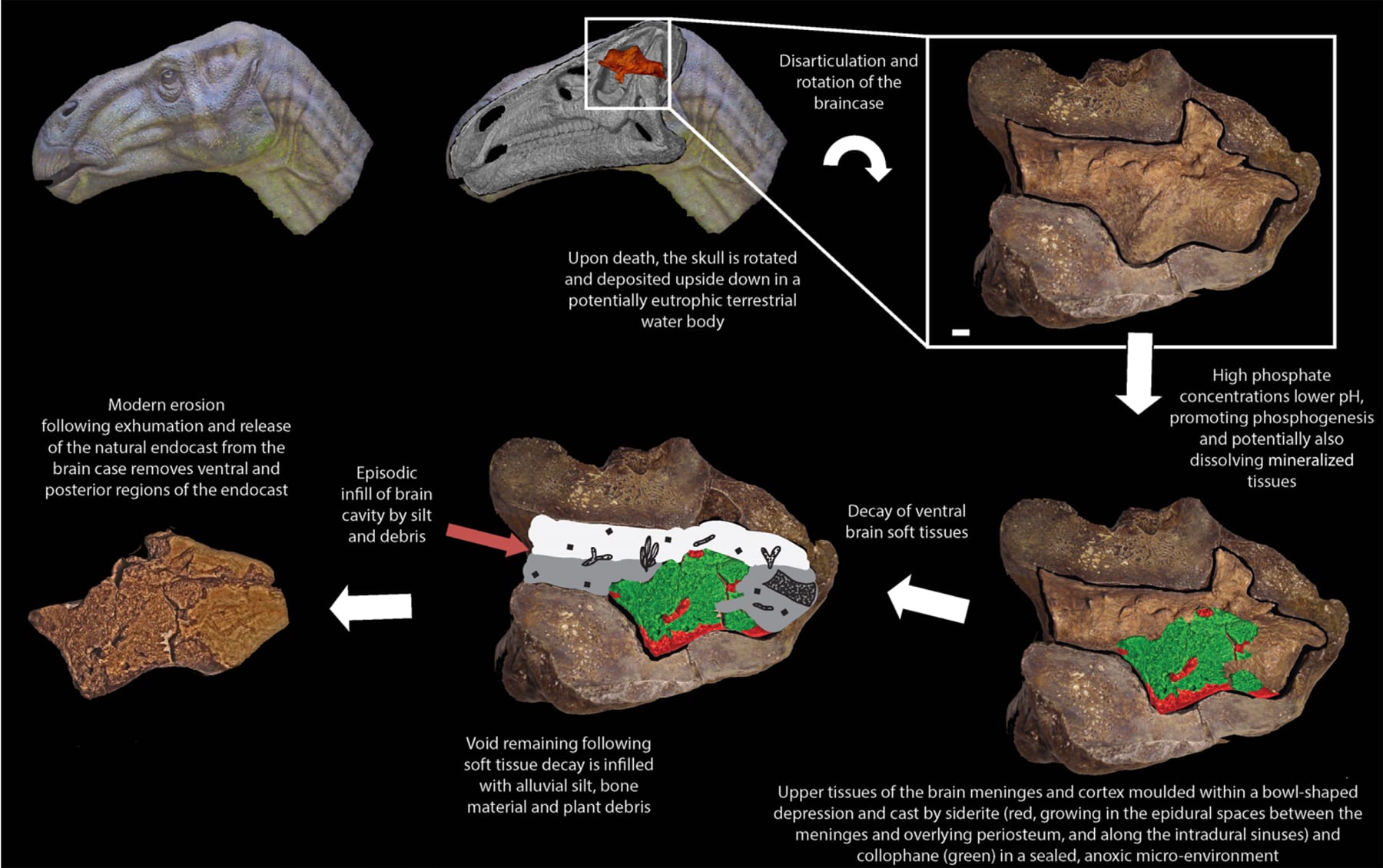 The authors think that when the dinosaur died, its head fell into a swamp. Swampy water can slow decomposition and allow soft tissue to be preserved. The brain then slowly started to fossilize. The part of the head that was above water decomposed and filled in with sediment. Then the skull broke apart and left the endocast all alone for the authors to find.