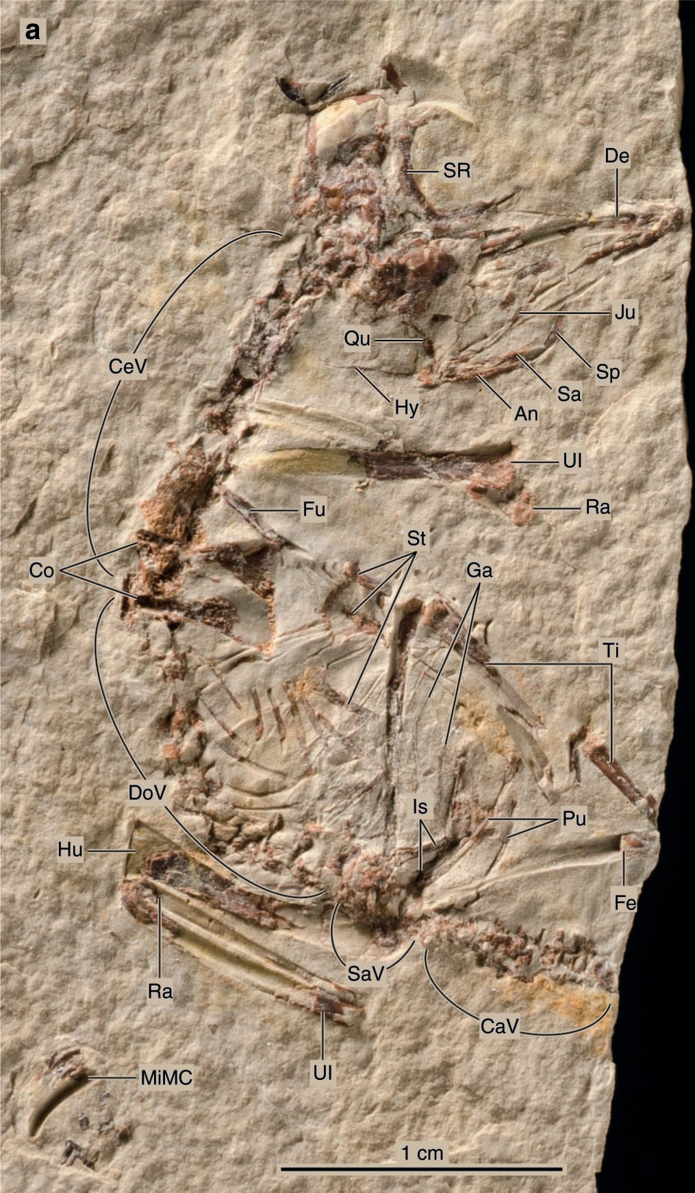The tail in birds is usually fused into a bone called the pygostyle. In young birds, the vertebrae are still separate. This fossil has more separate vertebrae than adult enantiornithines.
