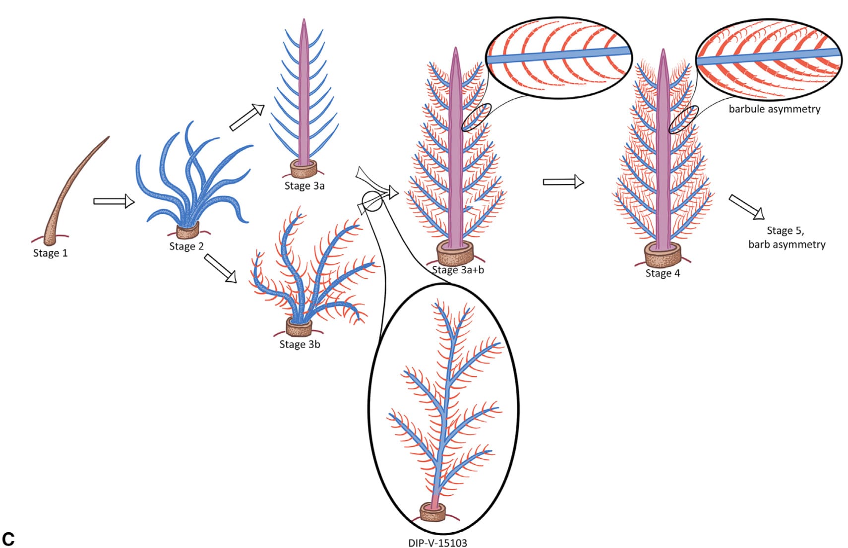 Let’s detour for a moment and talk about feathers. Modern bird feathers have an assortment of shapes and functions. Down feathers, what baby birds are initially covered with, have tufts of rami (ramus – singular, means “branch”) that are used to insulate the bird. As the bird grows, it develops body feathers. These are symmetrical. They have a central shaft (called a rachis), and branching rami on each side. Each ramus has barbules (little hooks), and each barbule has little hooks so that the rami can stick together, like Velcro. We have specimens of dinosaurs that show each of these stages, and we know how feathers grow in living birds, so we understand their evolution and development very well.