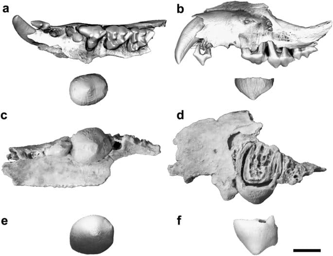Los dientes son muy importantes en la paleontología de mamíferos porque cada especie tiene una combinación única de cúspides y formas, lo que permite identificar especies a partir de dientes aislados. Este fósil tiene un diente todavía en la maxila con forma de cono, una base amplia y una punta pequeña. Este tipo de diente también se encuentra en otros animales que comen caracoles.