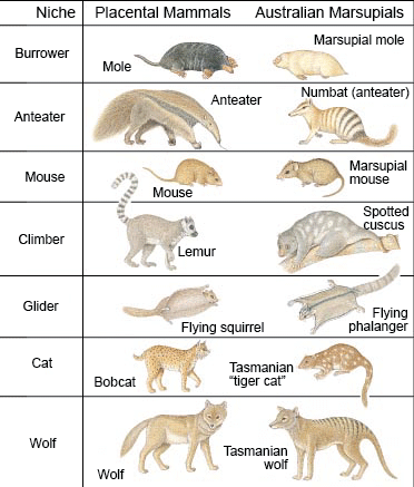 Los marsupiales viven en las Américas y en Australia y vienen en una variedad de formas y tamaños. Curiosamente, los marsupiales y los placentarios parecen “copiarse” en ambientes, dietas y estilos de vida. Hay excavadores, animales rápidos, arborícolas, grandes herbívoros y carnívoros en ambos grupos. Incluso hubo leones y lobos marsupiales (miren el video al final). Esto es un ejemplo de la evolución convergente, en la que distintos grupos de animales desarrollan características similares de manera independiente.