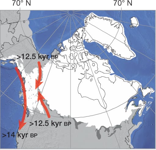 One last piece of the puzzle makes the story more complicated. There are human artifacts in the Americas starting around 13,400 years ago. So how did those people get there? The authors think that there were two pulses of immigration to the Americas: an earlier one from the coast, and a later one through the ice sheet. As always, more information will help to answer these questions.