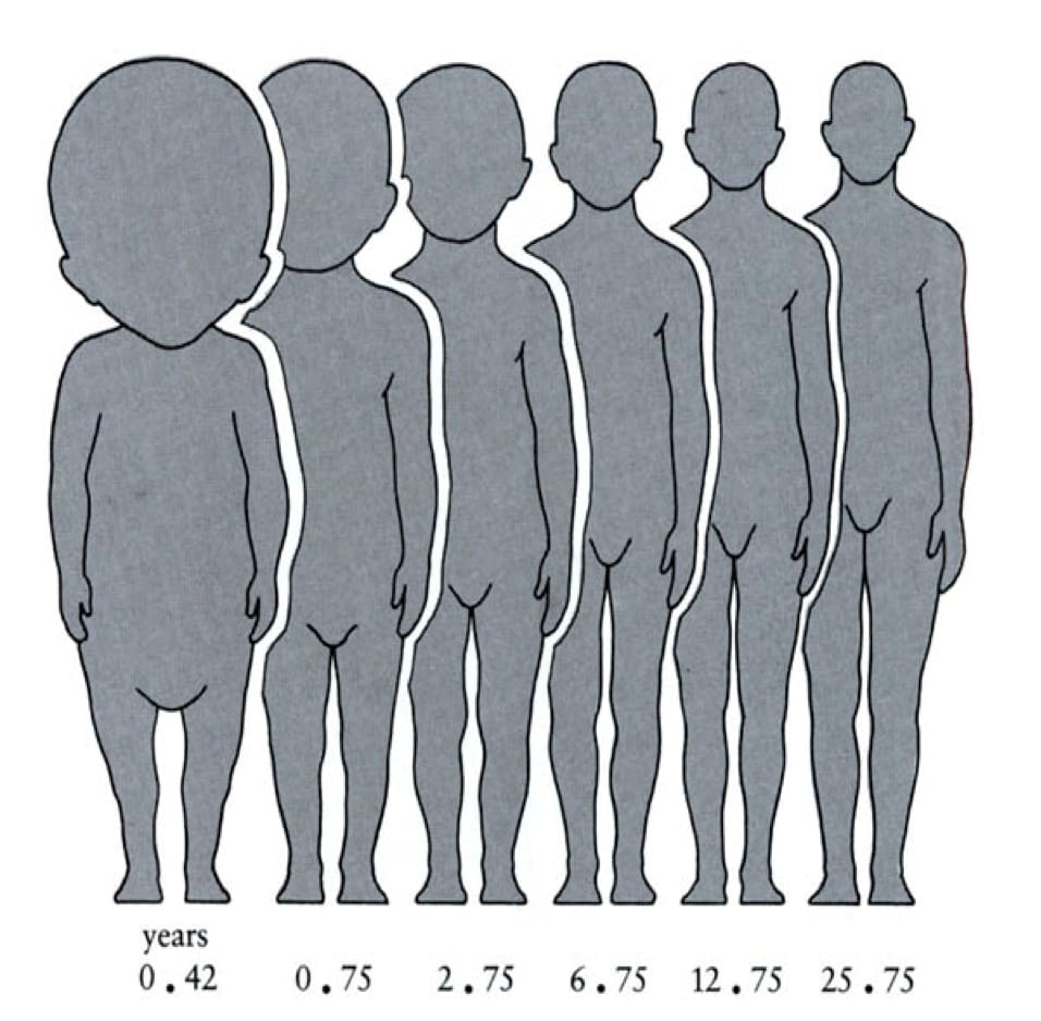 Primero, el bebe chiquitito Rapetosaurus krausei de Madagascar fue examinado. Este pequeño bebe muestra que los titanosaurios crecían isométricamente. Cuando el crecimiento es isométrico la forma de tu cuerpo no cambia a medida que creces. Esto es lo opuesto al crecimiento alométrico, durante el cual la forma de tu cuerpo sí cambia a medida que creces. Los humanos, entre muchos ejemplos, crecen alométricamente, así que la forma de nuestros cuerpos como bebes es muy diferente a la forma de nuestros cuerpos como adultos: