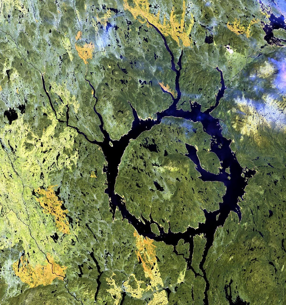 Otro ejemplo es el cráter Manicouagan en la región de Côte-Nord en Québec, Canadá. Tiene 100 kilómetros de diámetro y contiene un lago con forma de anillo y una isla. Se formó alrededor de 215,5 millones de años atrás por el impacto de un meteorito de cerca de 5 kilómetros de diámetro.