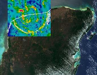 El cráter del meteorito que mató a la mayoría de los dinosaurios fue difícil de encontrar porque está parcialmente enterrado con piedras mas jóvenes y parcialmente sumergido bajo el agua. El cráter se formó 66 millones de años atrás, tiene 180 kilómetros de diámetro, y se formó por el impacto de un meteorito de 10 kilómetros de diámetro. Se encuentra en la Península de Yucatán en México.