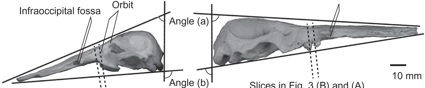 One last feature they looked for is the infraorbital foramen. The infraorbital foramen is a hole in the skull below the eye socket. This hole allows the nerve for sensation of the face to travel from the brain to the bill.