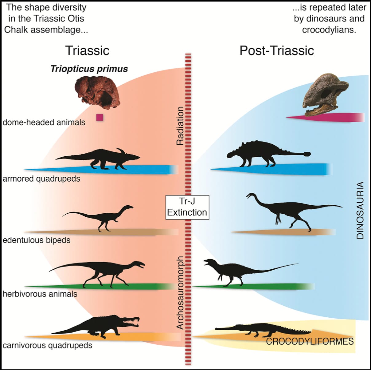 This new archosaur, Triopticus primus, is interesting because it has a dome-shaped head, similar to Pachycephalosaurusand its relatives, the dome-headed dinosaurs. This archosaur comes from the Otis Chalk Formation of the Triassic Period. That’s where the story becomes especially interesting.