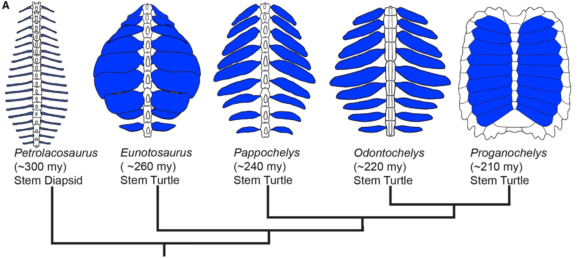 A new article examined some new fossil specimens of early turtles, ones that do not yet have full shells, and discovered something interesting. The sequence of evolution of the shell starts with the ribs becoming very wide. Wide ribs make the torso rigid (the opposite of flexible), and this has 2 consequences: