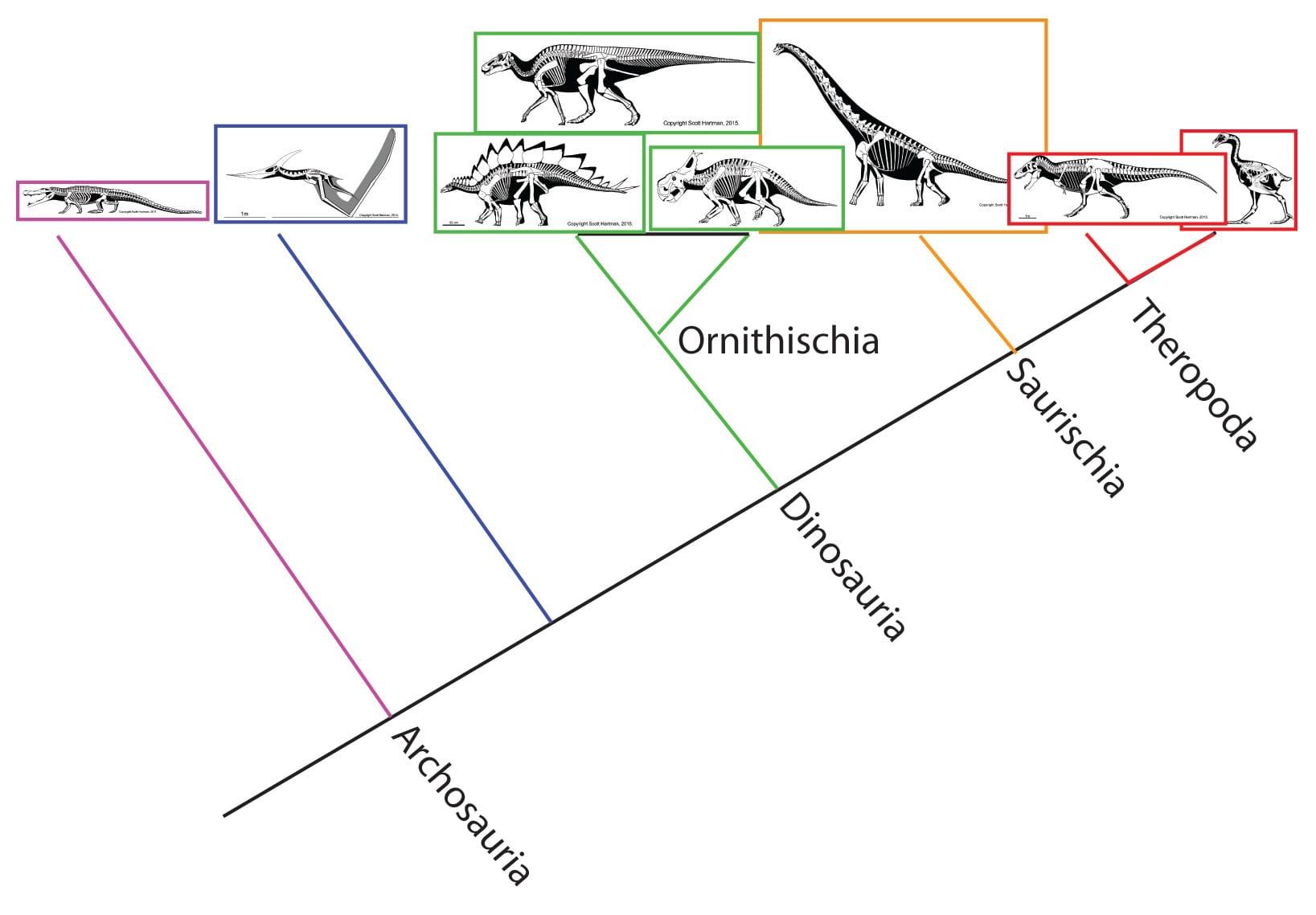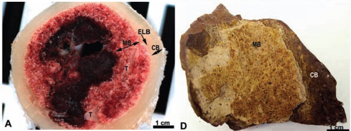 Empecemos con el [artículo] escrito por Schweitzer y otros en la revista Science. Estos autores descubrieron un tipo de hueso especial en el interior del hueso de la pierna (el fémur) en un Tiranosaurio rex. Este tipo de hueso solamente se puede encontrar hoy en los pájaros. Esto tiene sentido porque los pájaros son una clase de dinosaurio, los únicos que sobrevivieron la extinción al final del período Cretáceo.