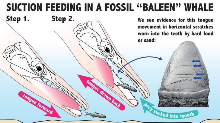 Este fósil muestra que las barbas de ballena tal vez evolucionaron más tarde de lo que pensábamos, porque esta ballena no tiene evidencia de barbas. También nos indica que esta manera de alimentarse por succión pudo haber sido un paso intermedio entre las ballenas con dientes y las que filtran su comida.