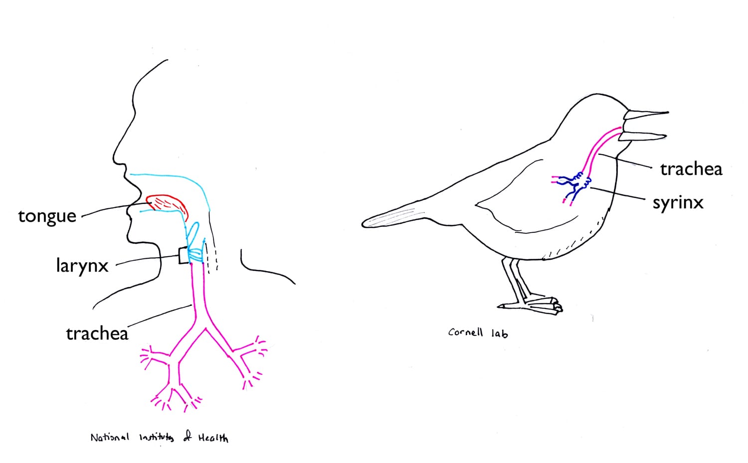This specimen has a voicebox preserved in its chest. Many animals produce sounds using their larynx (a section of the windpipe, or trachea, that houses the vocal cords). In birds, the voicebox (called a syrinx) is actually lower in the chest, at the base of the trachea.